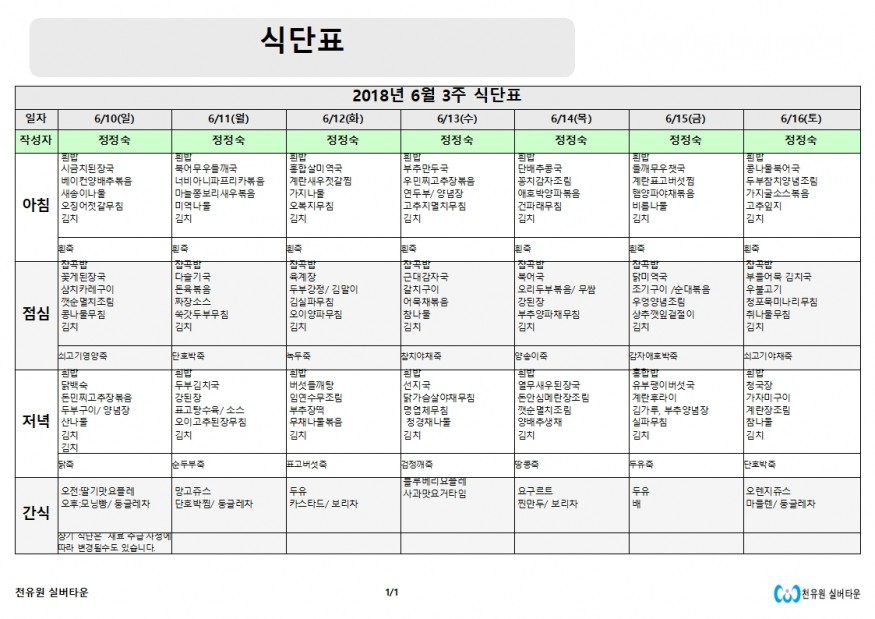 6월 3주 식단표 페이지 정보 작성자 천유원실버타운 작성일18-06-09 11:41 조회6,653회 댓글0건 관련링크 이전글 다음글 목록 본문 6월 셋째주 식단표 입니다. 댓글목록 등록된 댓글이 없습니다. 이전글 다음글 목록