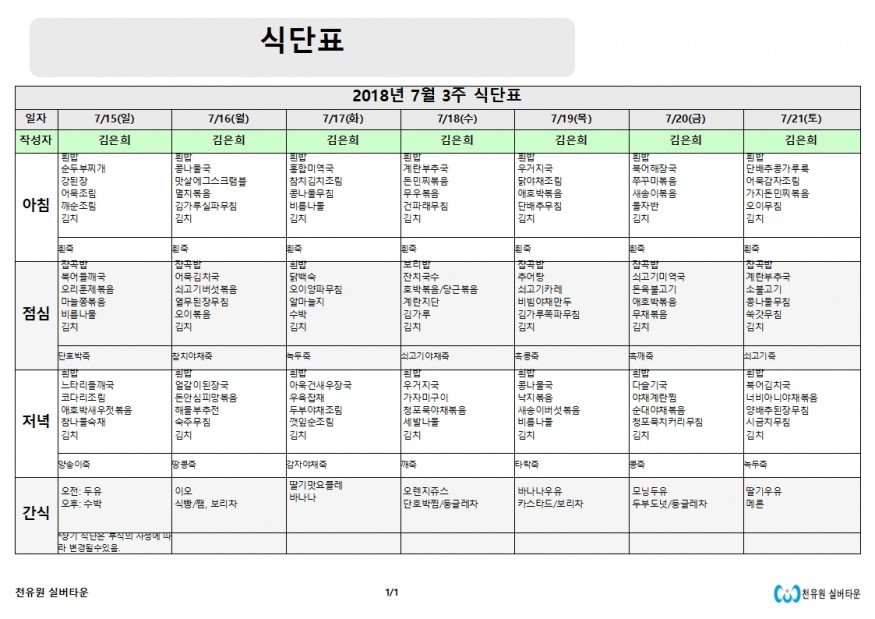 7월 3주 식단표 페이지 정보 작성자 천유원실버타운 작성일18-07-12 14:01 조회6,649회 댓글0건 관련링크 이전글 다음글 목록 본문 7월 세째주 식단표입니다. 댓글목록 등록된 댓글이 없습니다. 이전글 다음글 목록