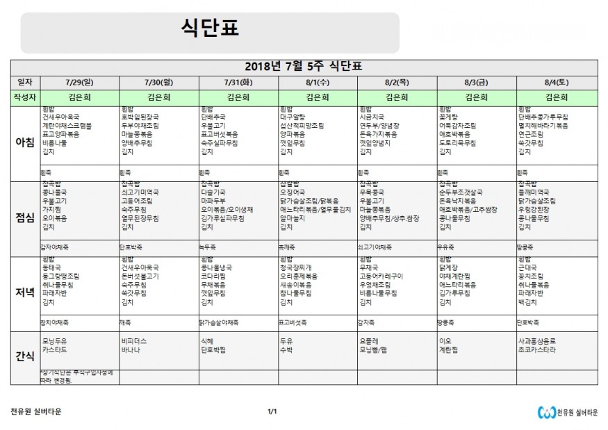 7월5주차 식단표 페이지 정보 작성자 천유원실버타운 작성일18-07-27 18:17 조회6,511회 댓글0건 관련링크 이전글 다음글 목록 본문 7월5주차 식단표 댓글목록 등록된 댓글이 없습니다. 이전글 다음글 목록