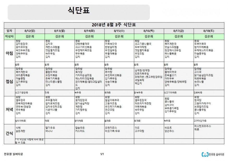 8월3째주 식단표 페이지 정보 작성자 천유원실버타운 작성일18-08-13 15:20 조회6,526회 댓글0건 관련링크 이전글 다음글 목록 본문 8월3째주 식단표 댓글목록 등록된 댓글이 없습니다. 이전글 다음글 목록