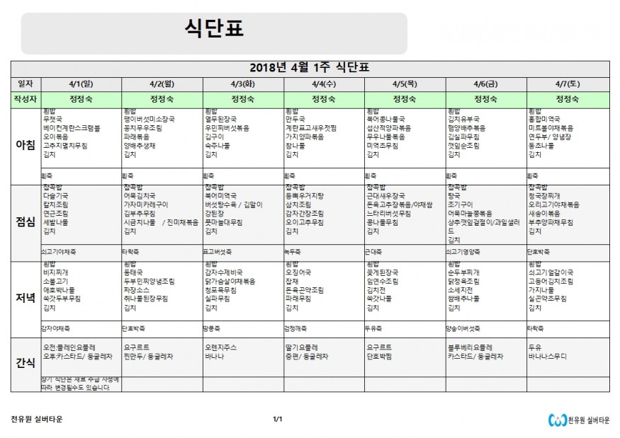 4월 1주 식단표 페이지 정보 작성자 천유원실버타운 작성일18-04-04 10:11 조회6,940회 댓글0건 관련링크 이전글 다음글 목록 본문 4월 첫째주 식단표입니다. 댓글목록 등록된 댓글이 없습니다. 이전글 다음글 목록