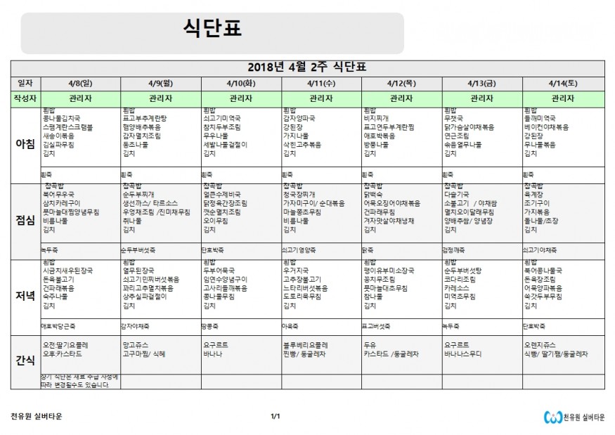 4월 2주 식단표 페이지 정보 작성자 천유원실버타운 작성일18-04-12 10:37 조회6,848회 댓글0건 관련링크 이전글 다음글 목록 본문 4월 둘째주 식단표입니다. 댓글목록 등록된 댓글이 없습니다. 이전글 다음글 목록