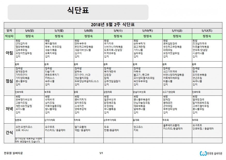 5월 2주 식단표 페이지 정보 작성자 천유원실버타운 작성일18-05-11 09:58 조회6,676회 댓글0건 관련링크 이전글 다음글 목록 본문 5월 둘째주 식단표 입니다. 댓글목록 등록된 댓글이 없습니다. 이전글 다음글 목록