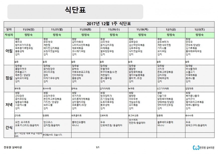12월 1주 식단표 페이지 정보 작성자 천유원실버타운 작성일17-12-09 10:49 조회6,911회 댓글0건 관련링크 이전글 다음글 목록 본문 12월 첫째주 식단표 댓글목록 등록된 댓글이 없습니다. 이전글 다음글 목록