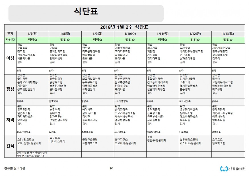 1월 2주 식단표 페이지 정보 작성자 천유원실버타운 작성일18-01-26 16:32 조회7,078회 댓글0건 관련링크 이전글 다음글 목록 본문 1월 둘째주 식단표입니다. 댓글목록 등록된 댓글이 없습니다. 이전글 다음글 목록