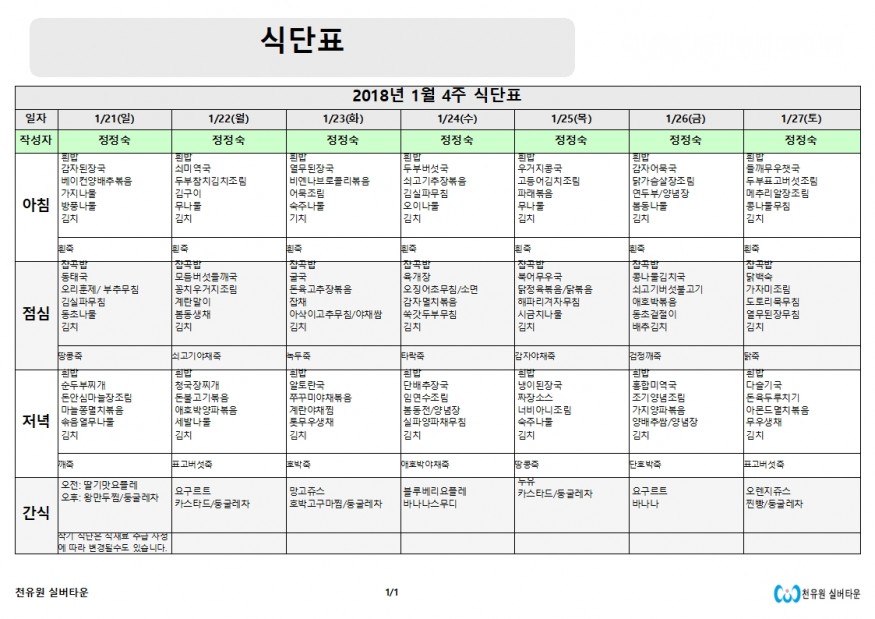 1월 4주 식단표 페이지 정보 작성자 천유원실버타운 작성일18-01-26 16:33 조회6,775회 댓글0건 관련링크 이전글 다음글 목록 본문 1월 넷째주 식단표입니다. 댓글목록 등록된 댓글이 없습니다. 이전글 다음글 목록