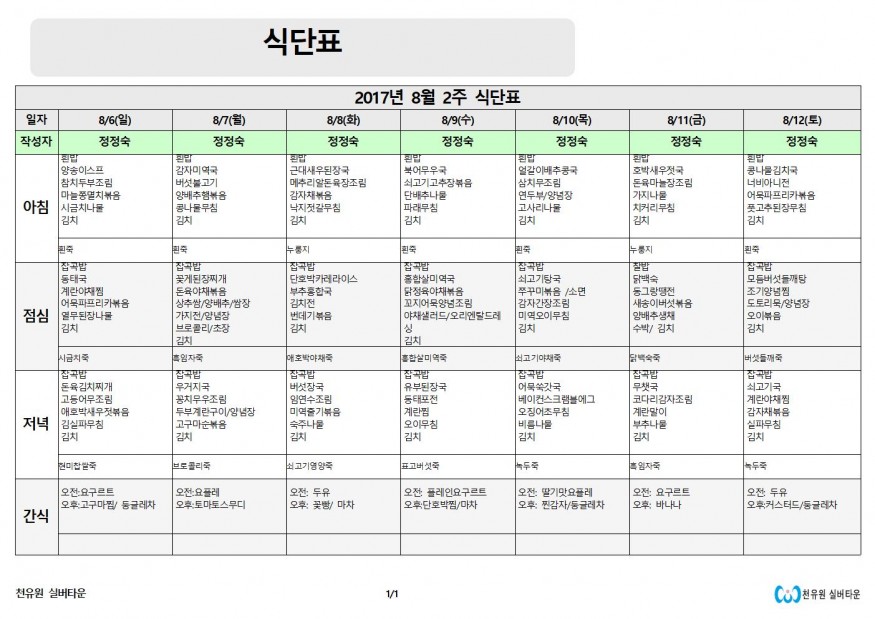 8월 둘째 주 식단표