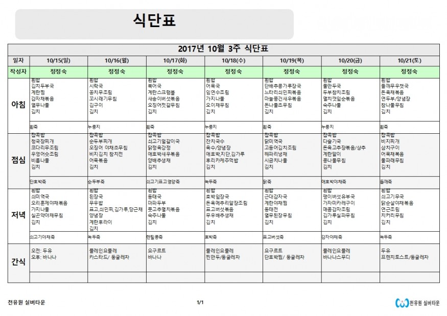 10월 3주 식단표 페이지 정보 작성자 천유원실버타운 작성일17-12-09 10:34 조회6,923회 댓글0건 관련링크 이전글 다음글 목록 본문 10월 셋째주 식단표입니다. 댓글목록 등록된 댓글이 없습니다. 이전글 다음글 목록