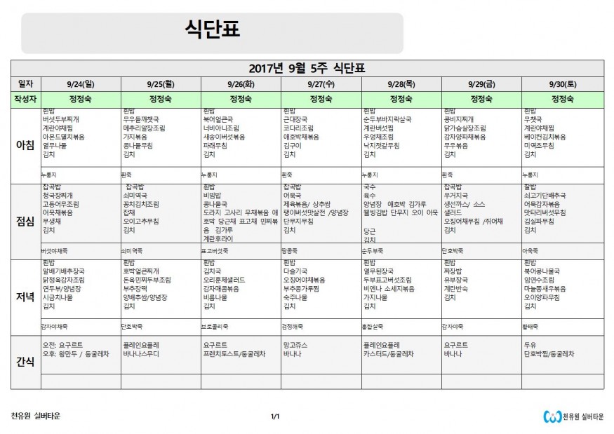9월 4주 식단표 페이지 정보 작성자 천유원실버타운 작성일17-09-27 10:58 조회7,189회 댓글0건 관련링크 이전글 다음글 목록 본문 9월 넷째주 식단표입니다. 댓글목록 등록된 댓글이 없습니다. 이전글 다음글 목록
