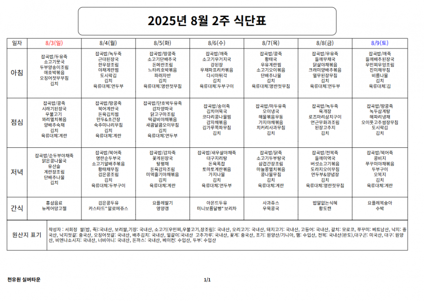 8월 2째주 식단표 페이지 정보 작성자 천유원실버타운 작성일25-08-01 17:09 조회1,850회 댓글0건 관련링크 이전글 다음글 목록 본문 8월 2째주 식단표 댓글목록 등록된 댓글이 없습니다. 이전글 다음글 목록