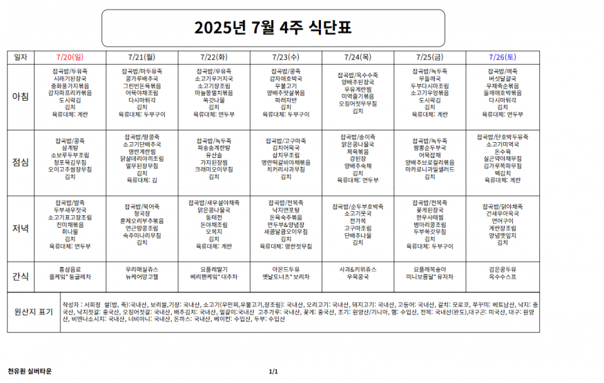 7월 4째주 식단표 페이지 정보 작성자 천유원실버타운 작성일25-07-22 08:06 조회2,328회 댓글0건 관련링크 이전글 다음글 목록 본문 7월 4째주 식단표 댓글목록 등록된 댓글이 없습니다. 이전글 다음글 목록