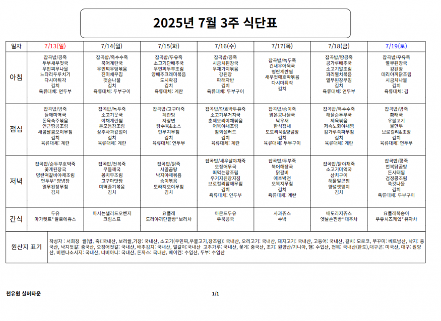 7월 3째주 식단표 페이지 정보 작성자 천유원실버타운 작성일25-07-14 07:44 조회2,583회 댓글0건 관련링크 이전글 다음글 목록 본문 7월 3째주 식단표 댓글목록 등록된 댓글이 없습니다. 이전글 다음글 목록