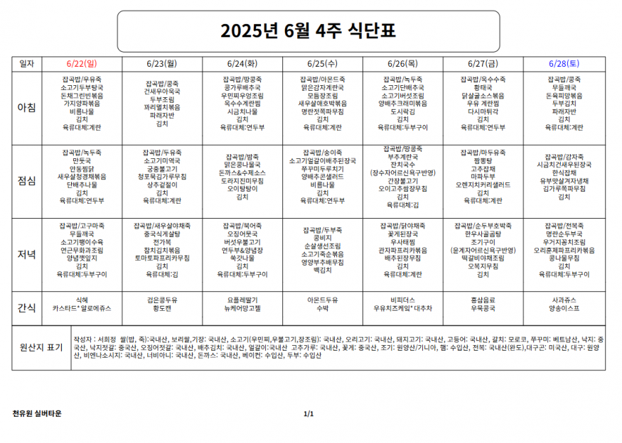 6월 4째주 식단표 페이지 정보 작성자 천유원실버타운 작성일25-06-23 07:41 조회2,779회 댓글0건 관련링크 이전글 다음글 목록 본문 6월 4째주 식단표 댓글목록 등록된 댓글이 없습니다. 이전글 다음글 목록
