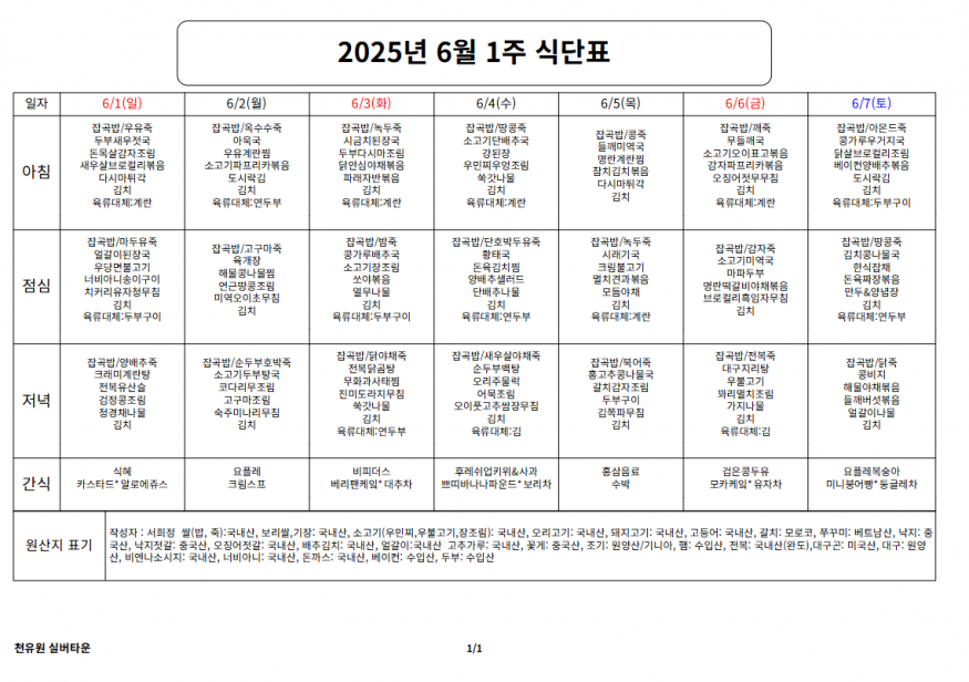 6월 1째주 식단표 페이지 정보 작성자 천유원실버타운 작성일25-06-03 14:58 조회3,200회 댓글0건 관련링크 이전글 다음글 목록 본문 6월 1째주 식단표 댓글목록 등록된 댓글이 없습니다. 이전글 다음글 목록