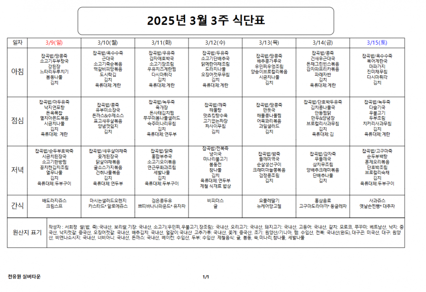 3월 3째주 식단표 페이지 정보 작성자 천유원실버타운 작성일25-03-11 08:09 조회4,115회 댓글0건 관련링크 이전글 다음글 목록 본문 3월 3째주 식단표 댓글목록 등록된 댓글이 없습니다. 이전글 다음글 목록
