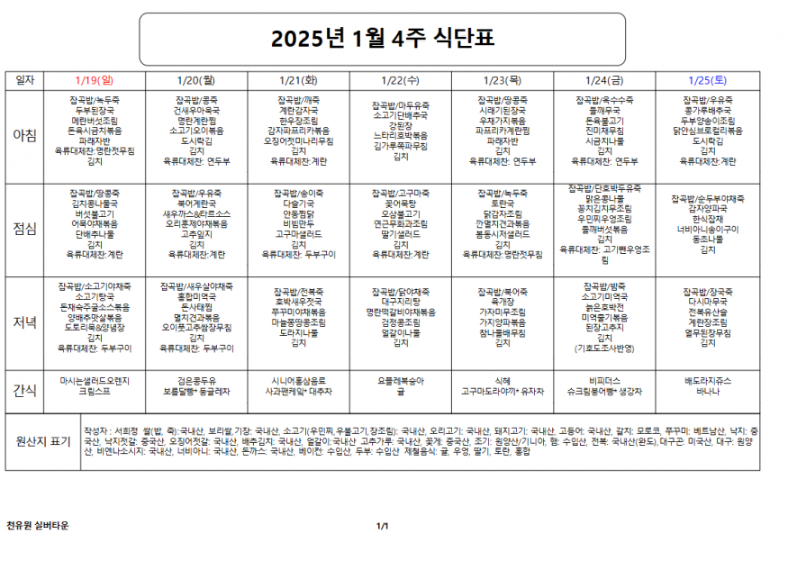1월 4째주 식단표 페이지 정보 작성자 천유원실버타운 작성일25-01-20 09:57 조회4,829회 댓글0건 관련링크 이전글 다음글 목록 본문 1월 4째주 식단표 댓글목록 등록된 댓글이 없습니다. 이전글 다음글 목록