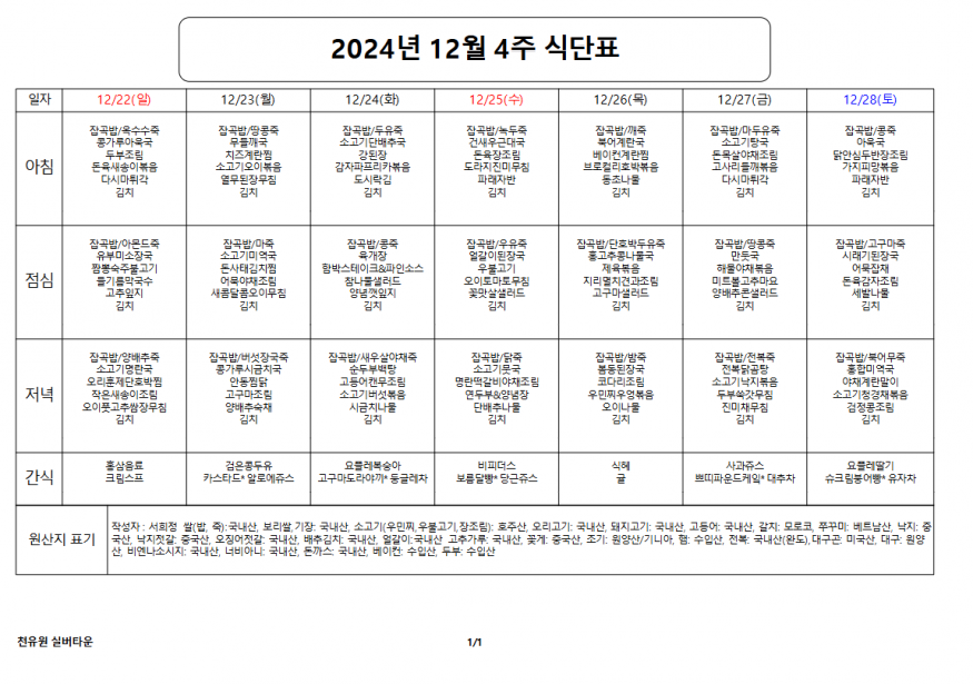12월 4째주 식단표 페이지 정보 작성자 천유원실버타운 작성일24-12-23 07:53 조회4,918회 댓글0건 관련링크 이전글 다음글 목록 본문 12월 4째주 식단표 댓글목록 등록된 댓글이 없습니다. 이전글 다음글 목록