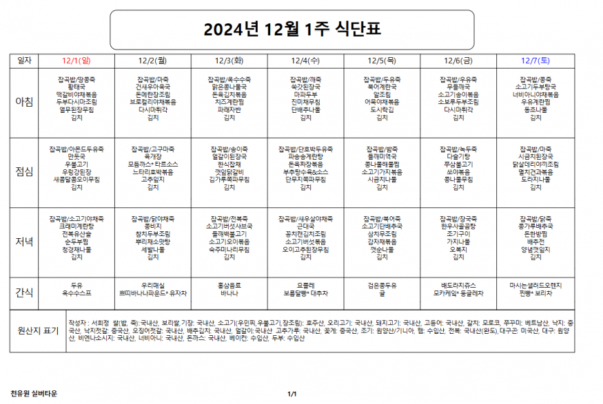 12월 1째주 식단표 페이지 정보 작성자 천유원실버타운 작성일24-12-02 08:20 조회4,942회 댓글0건 관련링크 이전글 다음글 목록 본문 12월 1째주 식단표 댓글목록 등록된 댓글이 없습니다. 이전글 다음글 목록