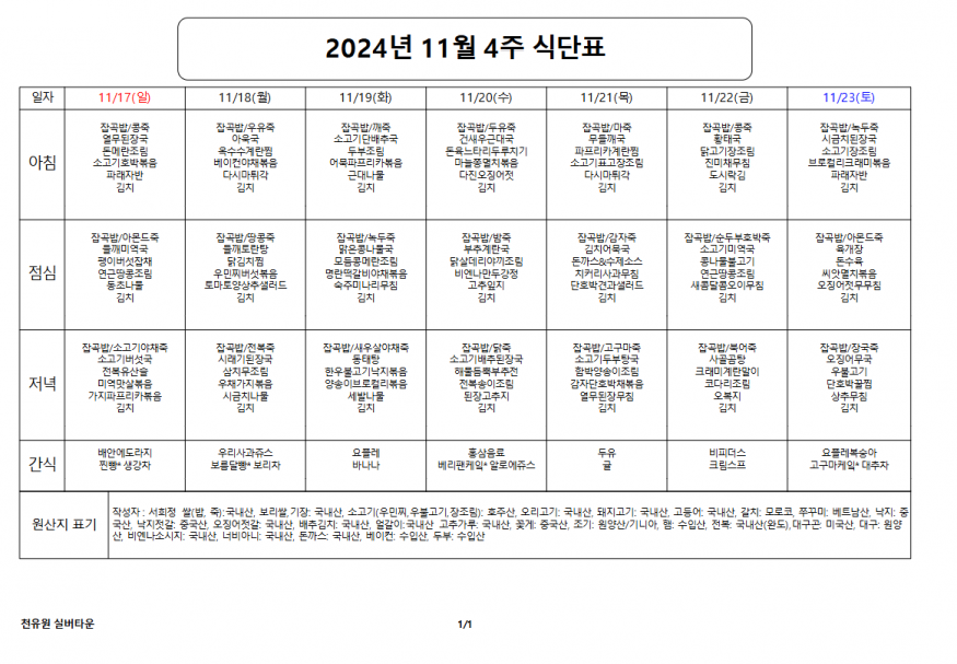 11월 4째주 식단표 페이지 정보 작성자 천유원실버타운 작성일24-11-18 12:43 조회5,460회 댓글0건 관련링크 이전글 다음글 목록 본문 11월 4째주 식단표 댓글목록 등록된 댓글이 없습니다. 이전글 다음글 목록