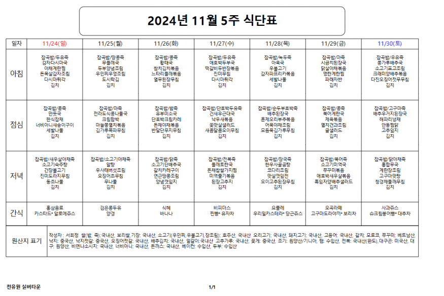 11월 5째주 식단표 페이지 정보 작성자 천유원실버타운 작성일24-11-25 08:26 조회5,421회 댓글0건 관련링크 이전글 다음글 목록 본문 11월 5째주 식단표 댓글목록 등록된 댓글이 없습니다. 이전글 다음글 목록