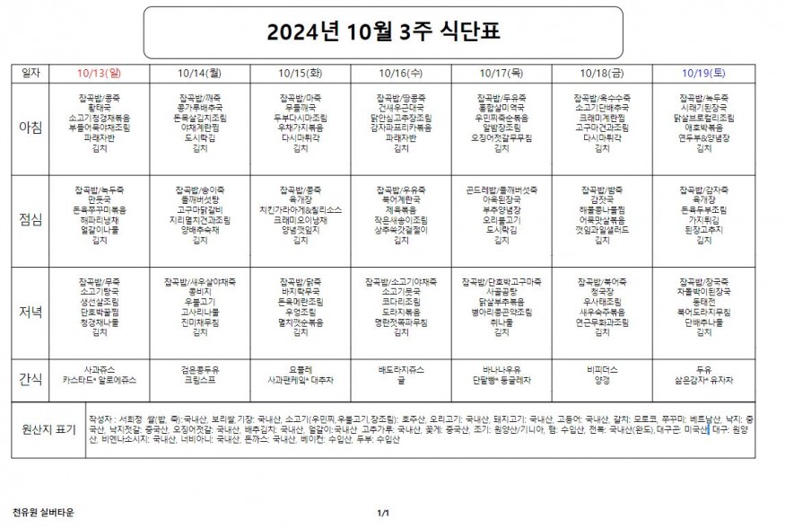 10월3째주 식단표 페이지 정보 작성자 천유원실버타운 작성일24-10-14 08:32 조회5,106회 댓글0건 관련링크 이전글 다음글 목록 본문 10월3째주 식단표 댓글목록 등록된 댓글이 없습니다. 이전글 다음글 목록