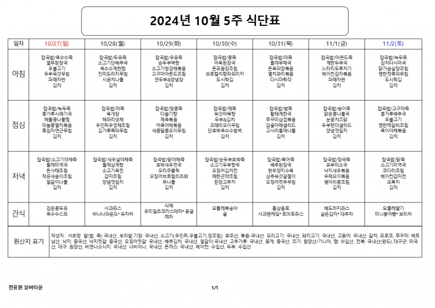10월 5째주 식단표 페이지 정보 작성자 천유원실버타운 작성일24-10-28 10:00 조회5,131회 댓글0건 관련링크 이전글 다음글 목록 본문 10월 5째주 식단표 댓글목록 등록된 댓글이 없습니다. 이전글 다음글 목록