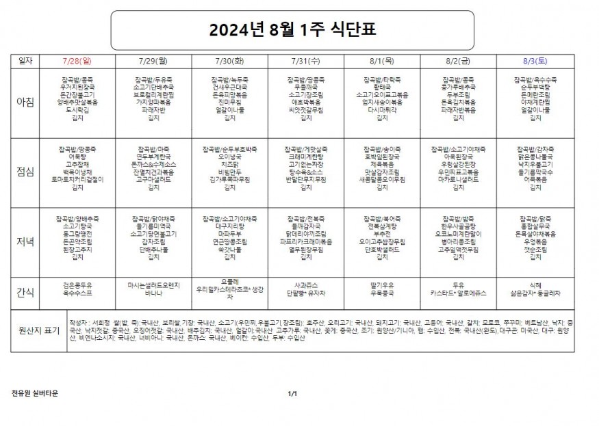 8월 1째주 식단표 페이지 정보 작성자 천유원실버타운 작성일24-07-31 13:15 조회5,171회 댓글0건 관련링크 이전글 다음글 목록 본문 8월 1째주 식단표 댓글목록 등록된 댓글이 없습니다. 이전글 다음글 목록