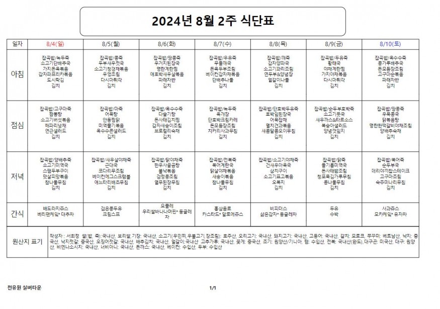 8월 2째주 식단표 페이지 정보 작성자 천유원실버타운 작성일24-08-06 08:20 조회5,164회 댓글0건 관련링크 이전글 다음글 목록 본문 8월 2째주 식단표 댓글목록 등록된 댓글이 없습니다. 이전글 다음글 목록