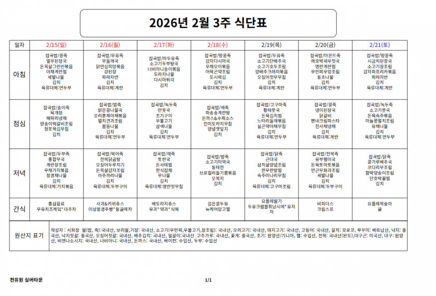 2월 3째주 식단표 페이지 정보 작성자 천유원실버타운 작성일26-02-19 13:39 조회75회 댓글0건 관련링크 이전글 다음글 목록 본문 2월 3째주 식단표 댓글목록 등록된 댓글이 없습니다. 이전글 다음글 목록