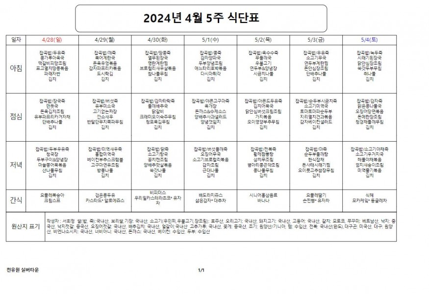 4월 5째주 식단표 페이지 정보 작성자 천유원실버타운 작성일24-04-30 08:40 조회5,309회 댓글0건 관련링크 이전글 다음글 목록 본문 4월 5째주 식단표 댓글목록 등록된 댓글이 없습니다. 이전글 다음글 목록