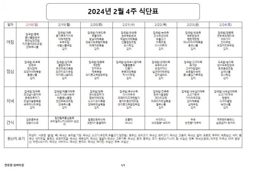 2월 4째주 식단표 페이지 정보 작성자 천유원실버타운 작성일24-02-19 13:28 조회5,368회 댓글0건 관련링크 이전글 다음글 목록 본문 2월 4째주 식단표 댓글목록 등록된 댓글이 없습니다. 이전글 다음글 목록