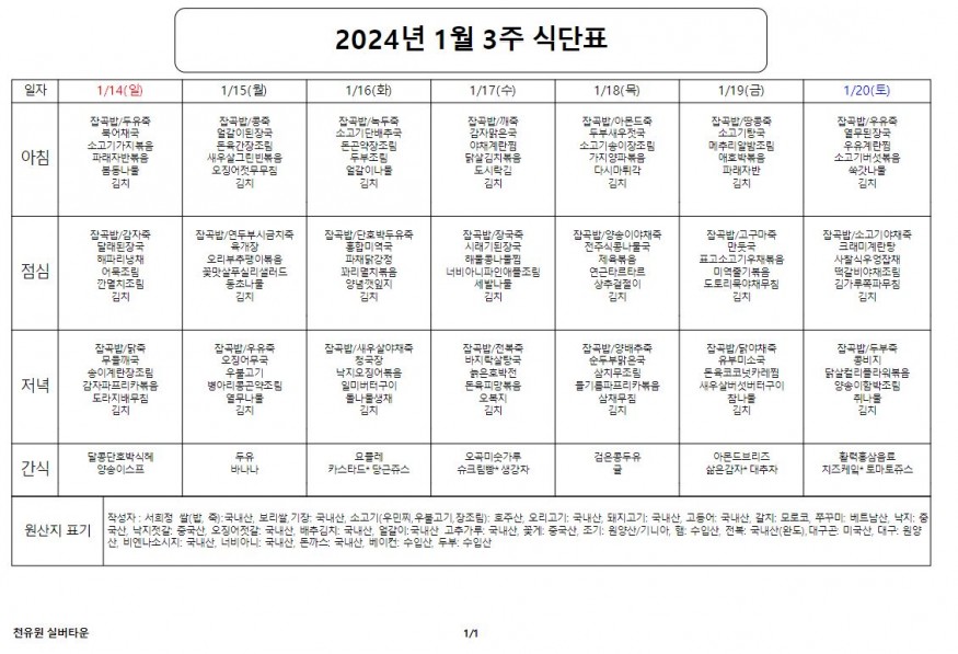 1월 3째주 식단표 페이지 정보 작성자 천유원실버타운 작성일24-01-16 08:17 조회5,411회 댓글0건 관련링크 이전글 다음글 목록 본문 1월 3째주 식단표 댓글목록 등록된 댓글이 없습니다. 이전글 다음글 목록