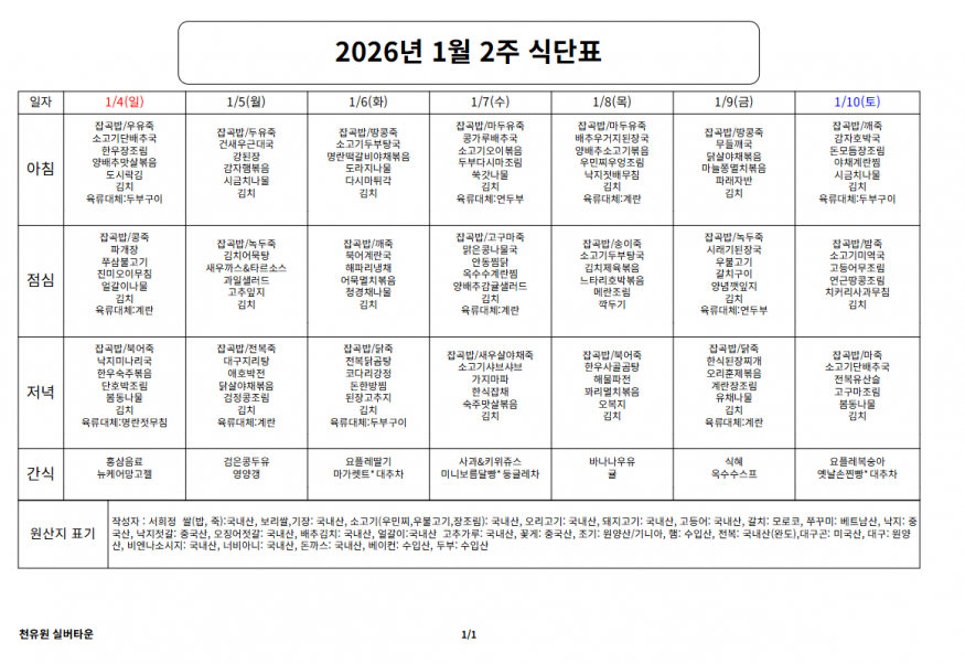 1월 2째주 식단표 페이지 정보 작성자 천유원실버타운 작성일26-01-07 14:13 조회81회 댓글0건 관련링크 이전글 다음글 목록 본문 1월 2째주 식단표 댓글목록 등록된 댓글이 없습니다. 이전글 다음글 목록