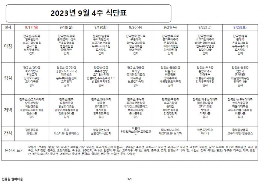 9월 4째주 식단표 페이지 정보 작성자 천유원실버타운 작성일23-09-18 10:34 조회5,593회 댓글0건 관련링크 이전글 다음글 목록 본문 9월 4째주 식단표 댓글목록 등록된 댓글이 없습니다. 이전글 다음글 목록