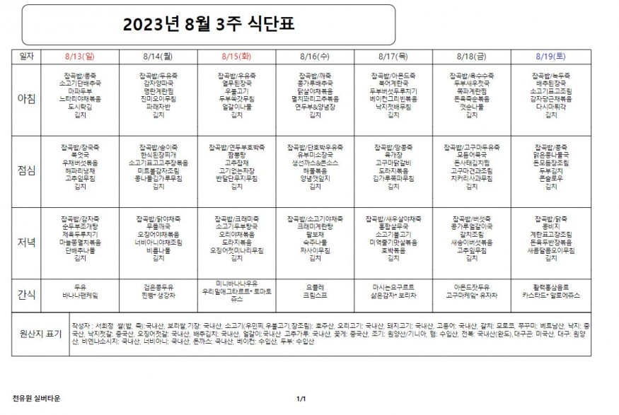 8월 3째주 식단표 페이지 정보 작성자 천유원실버타운 작성일23-08-14 08:56 조회5,670회 댓글0건 관련링크 이전글 다음글 목록 본문 8월 3째주 식단표 댓글목록 등록된 댓글이 없습니다. 이전글 다음글 목록