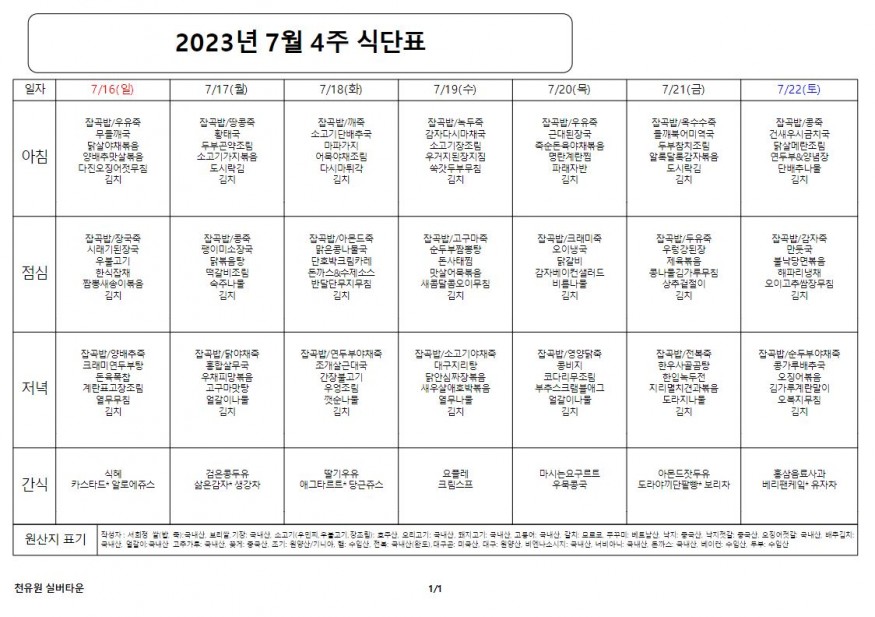 7월 4째주 식단표 페이지 정보 작성자 천유원실버타운 작성일23-07-17 09:40 조회5,699회 댓글0건 관련링크 이전글 다음글 목록 본문 7월 4째주 식단표 댓글목록 등록된 댓글이 없습니다. 이전글 다음글 목록