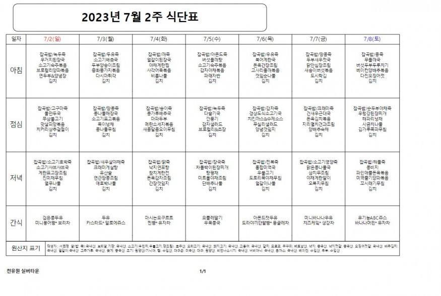 7월 2째주 식단표 페이지 정보 작성자 천유원실버타운 작성일23-07-03 08:42 조회5,814회 댓글0건 관련링크 이전글 다음글 목록 본문 7월 2째주 식단표 댓글목록 등록된 댓글이 없습니다. 이전글 다음글 목록