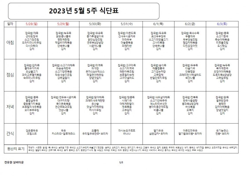 5월 5째주 식단표 페이지 정보 작성자 천유원실버타운 작성일23-05-30 09:02 조회5,909회 댓글0건 관련링크 이전글 다음글 목록 본문 5월 5째주 식단표 댓글목록 등록된 댓글이 없습니다. 이전글 다음글 목록