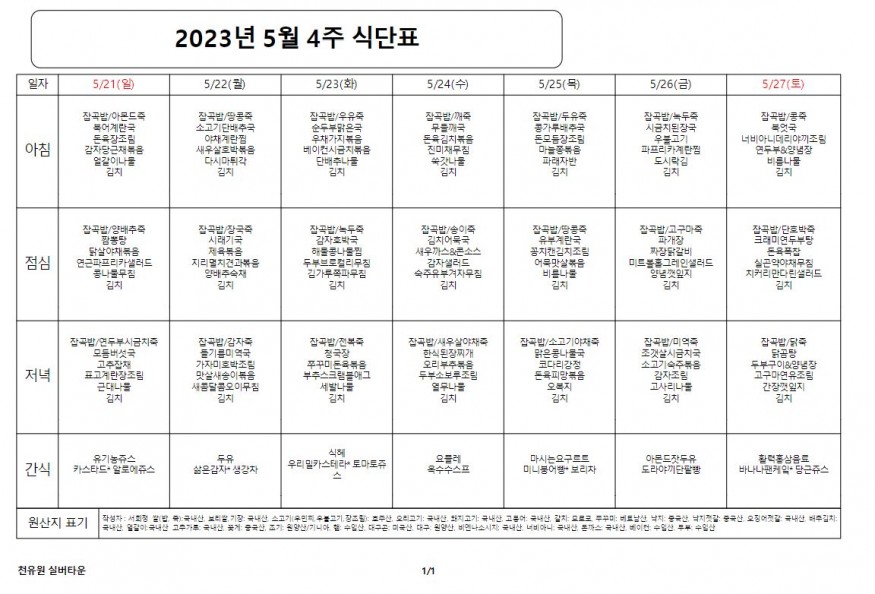 5월 4째주 식단표 페이지 정보 작성자 천유원실버타운 작성일23-05-22 13:44 조회5,866회 댓글0건 관련링크 이전글 다음글 목록 본문 5월 4째주 식단표 댓글목록 등록된 댓글이 없습니다. 이전글 다음글 목록