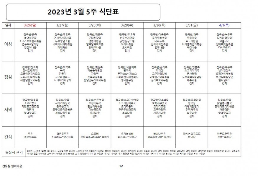 3월 5째주 식단표 페이지 정보 작성자 천유원실버타운 작성일23-03-27 12:50 조회5,897회 댓글0건 관련링크 이전글 다음글 목록 본문 3월 5째주 식단표 댓글목록 등록된 댓글이 없습니다. 이전글 다음글 목록