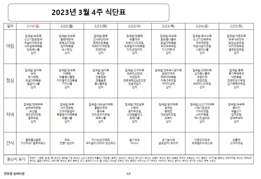 3월 4째주 식단표 페이지 정보 작성자 천유원실버타운 작성일23-03-20 08:42 조회5,814회 댓글0건 관련링크 이전글 다음글 목록 본문 3월 4째주 식단표 댓글목록 등록된 댓글이 없습니다. 이전글 다음글 목록