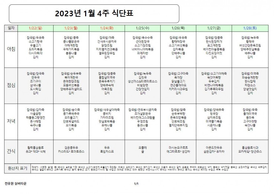 1월 4째주 식단표 페이지 정보 작성자 천유원실버타운 작성일23-01-26 07:52 조회5,846회 댓글0건 관련링크 이전글 다음글 목록 본문 1월 4째주 식단표 댓글목록 등록된 댓글이 없습니다. 이전글 다음글 목록