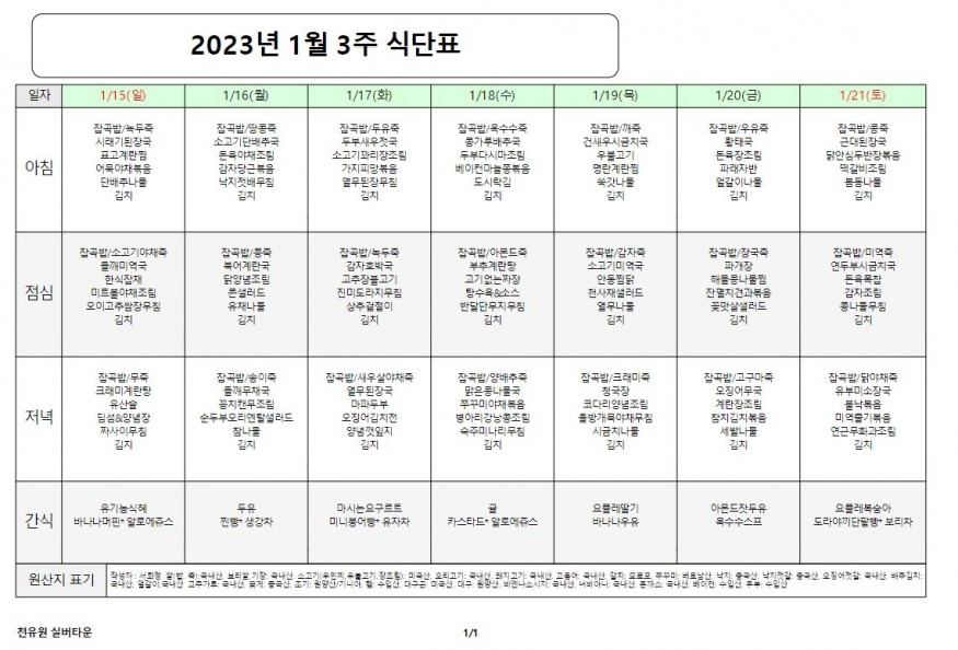 1월 3째주 식단표 페이지 정보 작성자 천유원실버타운 작성일23-01-16 12:31 조회5,954회 댓글0건 관련링크 이전글 다음글 목록 본문 1월 3째주 식단표 댓글목록 등록된 댓글이 없습니다. 이전글 다음글 목록