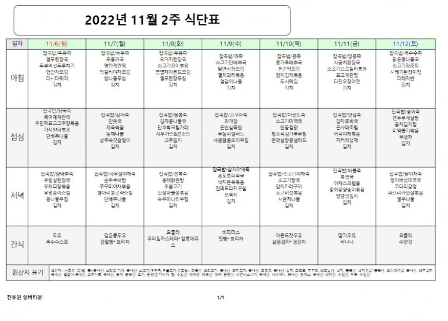 11월2째주 식단표 페이지 정보 작성자 천유원실버타운 작성일22-11-07 10:38 조회6,515회 댓글0건 관련링크 이전글 다음글 목록 본문 11월2째주 식단표 댓글목록 등록된 댓글이 없습니다. 이전글 다음글 목록