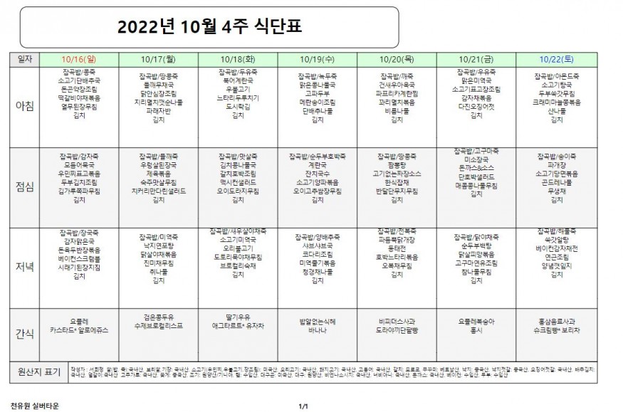 10월 4째주 식단표 페이지 정보 작성자 천유원실버타운 작성일22-10-18 15:47 조회5,767회 댓글0건 관련링크 이전글 다음글 목록 본문 10월 4째주 식단표 댓글목록 등록된 댓글이 없습니다. 이전글 다음글 목록