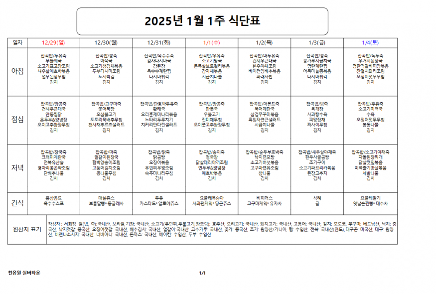 25년 1월 1째주 식단표 페이지 정보 작성자 천유원실버타운 작성일25-01-02 09:16 조회4,831회 댓글0건 관련링크 이전글 다음글 목록 본문 25년 1월 1째주 식단표 댓글목록 등록된 댓글이 없습니다. 이전글 다음글 목록
