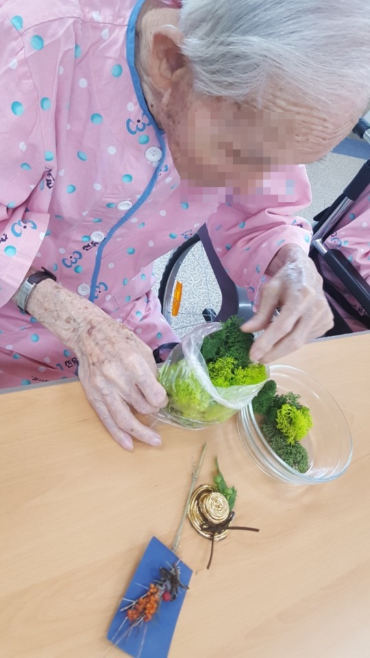 월 2회 격주 화요일 마다 원예치료 강사님께서 방문을 하시어 어르신들이 직접 오아이스에나 화병에다 이끼등을 담아 자신만의 칼라로 표현을 합니다.