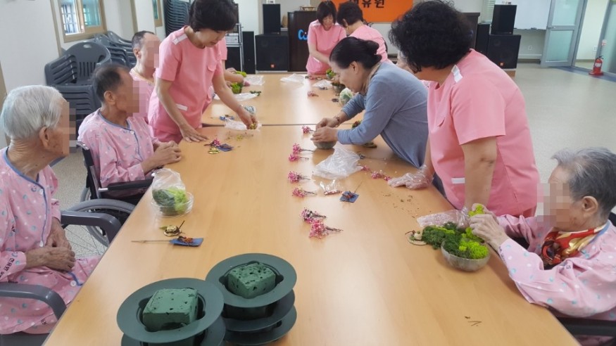 이날은 꽃이아닌 이끼로 예쁜잔디처럼 만들며 강사선생님께서 직접 제작해온 걸로 꽃고 나니 아름다운 하나의 작품이 완성이 되었습니다. 향은 나질않는다는 어르신들도 몇계시지만 그래도 이시간이 제일 기다린다는 어르신들이 대부분이셨습니다.